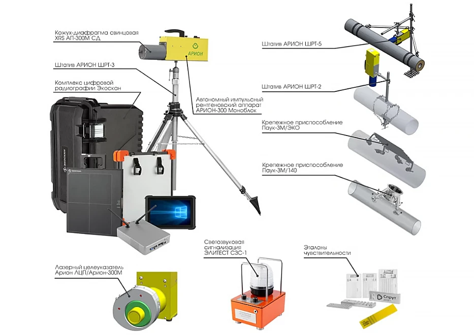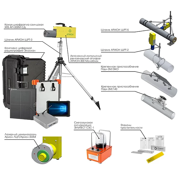 В комплексе «АРВИКОН» применяется легкий, компактный и простой в управлении импульсный рентгеновский аппарат АРИОН-300 в моноблочном исполнении. Моноблок предназначен для эксплуатации в полевых условиях, а также в условиях заводских цехов и лабораторий, когда требуется проведение радиографического контроля труднодоступных мест.