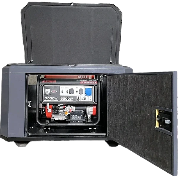 Бензиновый генератор A-iPower A7000EAX в супертихом зимнем кожухе 1400SS RAL 7024 - надежный источник питания мощностью 6.5 кВт. Главные преимущества модели - до 12 часов работы на одном баке топлива и возможность подключения высоко индуктивных приборов с пусковой мощностью до 14 кВA.