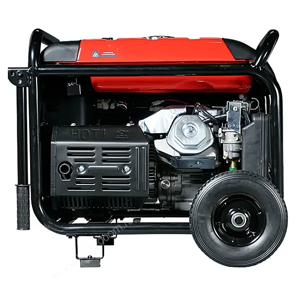 Встроенные колеса и откидные ручки значительно упрощают перемещение бензогенератора по объекту. Амортизирующие упоры с резиновыми подушками гасят вибрации от работы двигателя и препятствуют опрокидыванию при установке на неровном грунте.