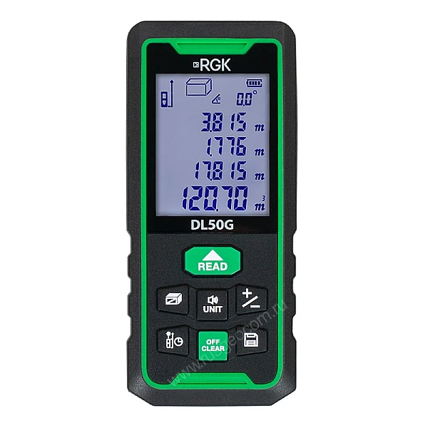 Лазерный дальномер RGK DL50G - зеленый луч служит для измерения расстояний, длин, высот, площадей и объемов. Главное преимущество - яркий зеленый луч, который гораздо лучше красного видно при ярком солнечном свете, например, при работе на улице или в просторных помещениях - ангарах, складах и т.д.