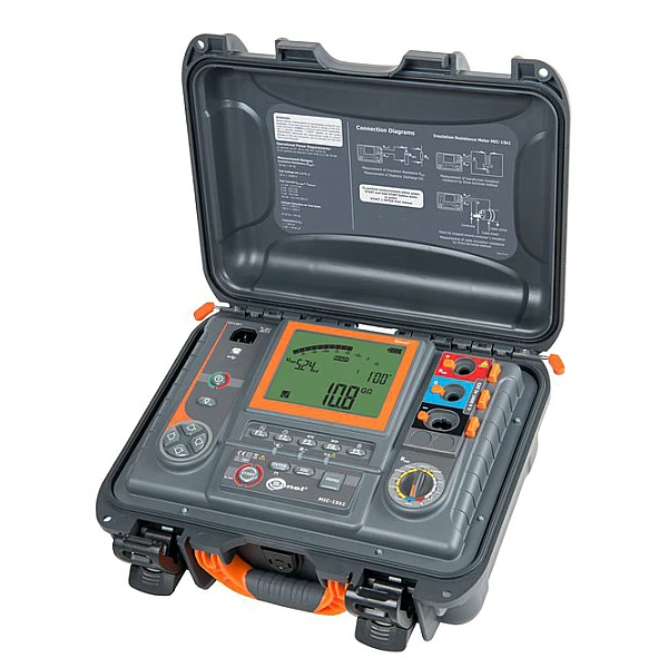 MIC-15k1 – цифровой мегаомметр, предназначенный для испытаний электрической прочности и измерения сопротивления изоляции электроустановок системы электроснабжения под действием электромагнитного поля сверхвысокого класса напряжения. Максимальное измерительное напряжение составляет 15000 В постоянного тока с диапазоном измеряемого сопротивления до 40 ТОм. Установка трёх интервалов времени позволяет автоматически рассчитывать коэффициент абсорбции (увлажнённости), поляризации (старения) и коэффициент разряда диэлектрика. В процессе измерения сопротивления изоляции происходит измерение ёмкости и тока утечки. Электромагнитные помехи, благодаря встроенному цифровому фильтру, не влияют на результат измерений.