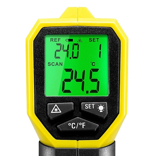 Мониторинг температуры поверхности электрических устройств, двигателей, систем охлаждения или стен является важной задачей при оценке энергоэффективности. Непрерывное измерение температуры часто позволяет избежать больших повреждений и дорогостоящих восстановительных работ. Поскольку не нужно прикасаться к поверхностям, которые могут быть слишком горячими или холодными, пользователь будет в безопасности при проведении измерений инфракрасным методом. Trotec BP17 надежный и точный пирометр для измерения температуры поверхности. Его инфракрасный датчик позволяет измерять температуру в широком диапазоне от -50 °C до +380 °C. Вы можете заранее определить эталонную температуру, а возможные отклонения можно указать и затем контролировать с помощью визуальных и акустических сигналов тревоги. При настройке диапазона допуска вы можете выбрать между 1°C, 3°C и 5°C. Прибор оснащен лазерным целеуказателем который указывает центр измеряемого пятна поверхности (оптическое разрешение 10:1). Большой дисплей с подсветкой гарантирует превосходный обзор измеренных значений даже при плохом освещении, а современный эргономичный дизайн с удобной рукояткой обеспечивает удобное управление. Когда устройство не используется, оно автоматически отключается, таким образом, снижает и так низкое энергопотребление. С помощью удобной сумки на ремне можно удобно носить пирометр и всегда иметь его под рукой.