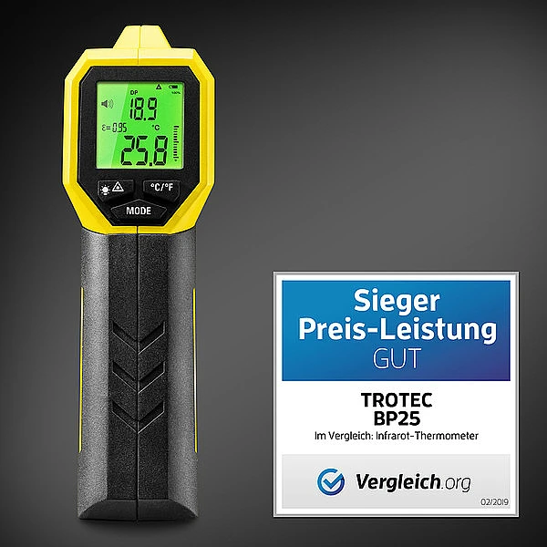 Одного взгляда достаточно, чтобы понять достигнута ли точка росы. Цвет дисплея зеленый – все нормально, оранжевый – показатели критические, красный - достигнута точки росы. Trotec BP25 дает вам возможность проверить поверхности, такие как внутренние стены и фасады, на наличие холодных мест с высоким потенциалом роста плесени. Инфракрасные бесконтактные измерения температуры поверхности стен могут быть выполнены быстро и легко, а температура точки росы будет определена автоматически. Даже в условиях плохого освещения измеренные значения можно легко прочитать на удобно расположенном ЖК-дисплее с подсветкой. Точка измерения отображается на измеряемой поверхности с помощью встроенного двойного лазера. Для определения точки росы прибор дополнительно измеряет текущую температуру в помещении и уровень влажности в воздухе. BP25 с функцией акустической и визуальной сигнализации, позволяет значительно сократить время обследования больших поверхностей, быстро определяя места с повышенным риском появления плесени из-за конденсации. Плесень начинает формироваться на поверхностях материала, когда они подвергаются повышенной относительной влажности в течении длительных периодов времени. Прибор предупреждает вас как акустически, так и визуально за несколько градусов до достижения фактической точки росы.