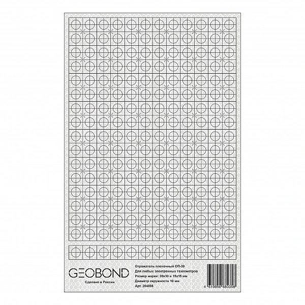 Пленочные отражатели Geobond ОП-30 используются с тахеометрами любых производителей. Изготовлены отражатели из новейшей высококачественной пленки призматического типа со сверхвысокой световозвращающей эффективностью. Коэффициент отражения данной пленки RA составляет 600 (кд/лк/ м2), что позволяет производить измерения на расстояниях до 500 метров.